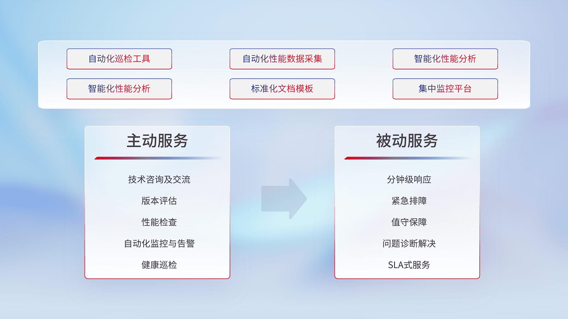 智能化工具和标准化文档,,,保障服务质量,,提供主动服务(包含技术咨询、、、、版本评估、、、性能检查、、、、自动化监控与告警、、、健康巡检)和被动服务包含(分钟级响应、、、紧急排障、、值守保障、、、问题诊断解决、、SLA服务)。。
