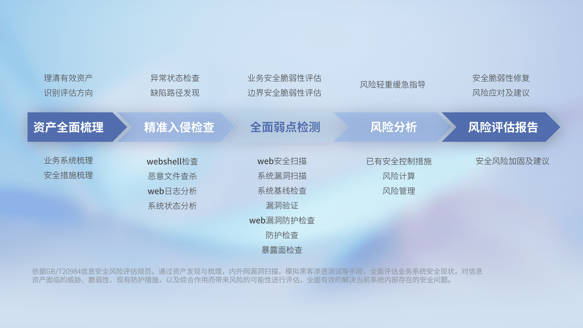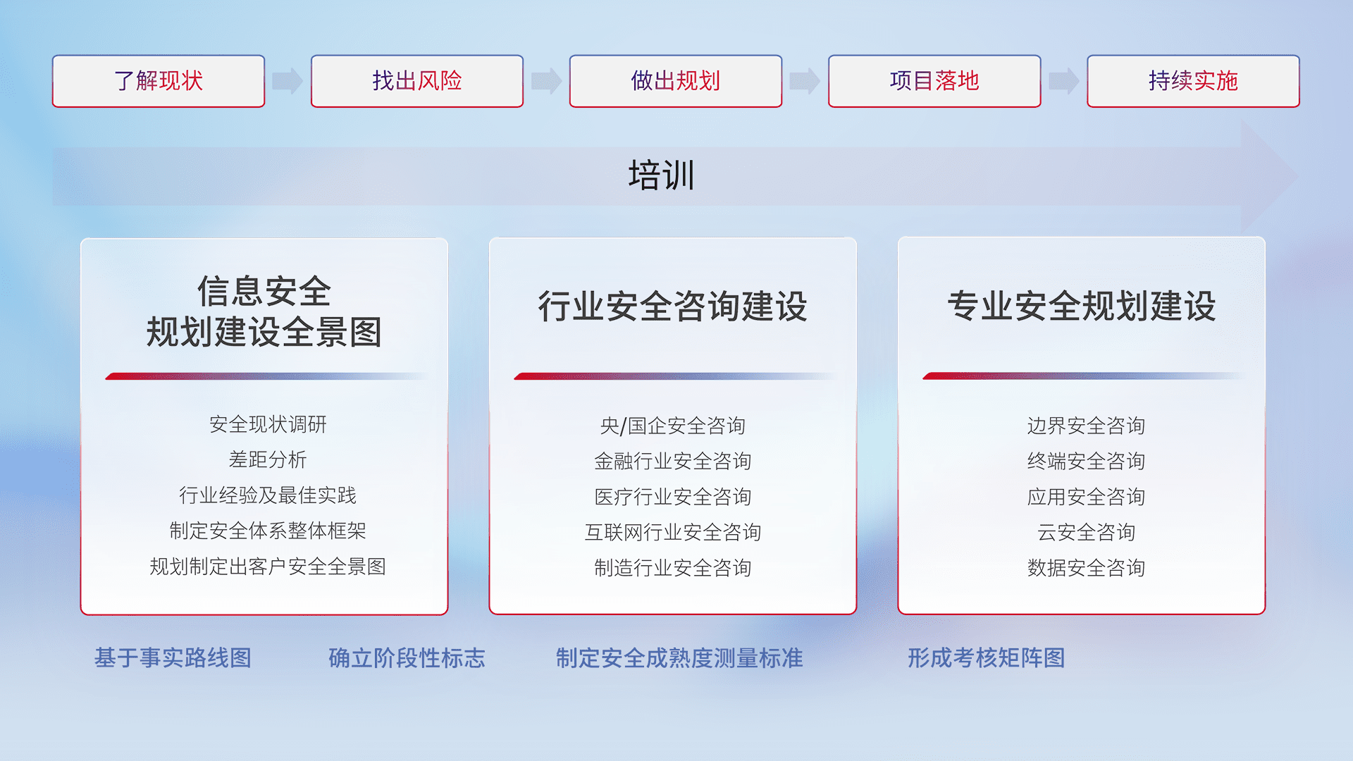 针对客户行业特性,,,以专业的安全服务+多厂商联合解决方案提供专属的一站式安全管理服务,,,帮助客户全面感知网络空间威胁,,基于识别、、、检测、、、、分析、、、、防护、、、、监测、、、响应的服务理论模型,,,从方案咨询、、集成交付、、、、评估验证、、、优化加固、、运维运营,,致力于为客户提供完整的闭环管理式安全服务。。。以实战经验为客户打造高抵御风险的安全体系,,,,帮助客户发现威胁、、、、对抗威胁、、处置威胁,,不断积累安全对抗能力,,,,持续保障数字化安全。。