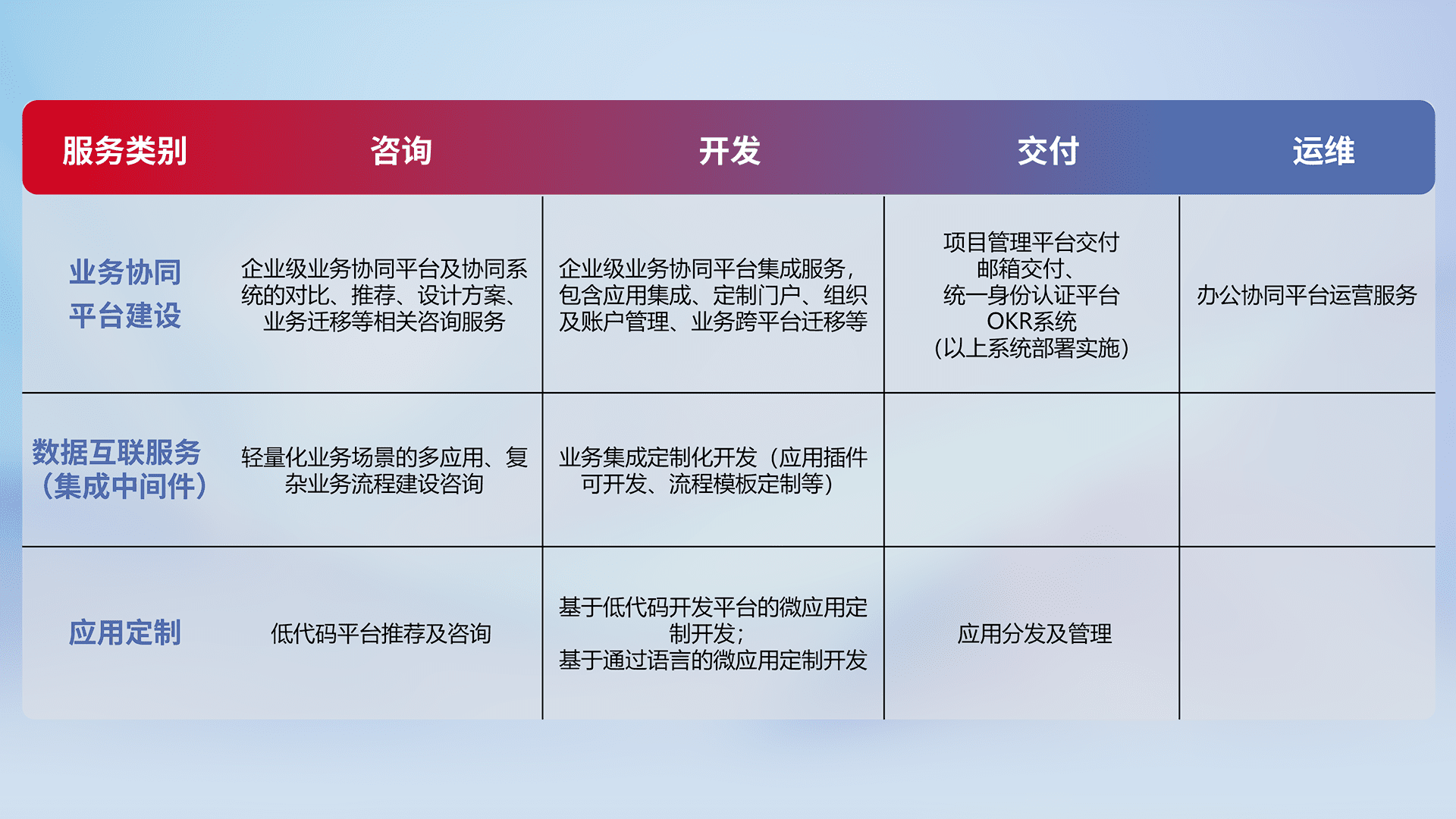 针对钉钉、、、企微、、IDaas等平台级产品提供产品的规划、、、、方案、、交付、、、定制化开发等服务,,,实现如统一协同办公、、、、智能客户服务、、、混合会议管理、、、智能数据查询、、、、等业务场景,,,,实现数字化转型。。。